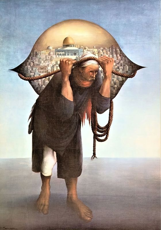 Murkus laat zich inspireren door een schilderij van de Palestijnse kunstenaar Suleiman Mansour, Jamal Al Mahamel, waarop een man de stad Jeruzalem op zijn rug draagt. Hoeveel kan een mens dragen? Waar ligt het breekpunt? Wanneer verandert de strijd tegen vernietiging in een daad van vernietiging?