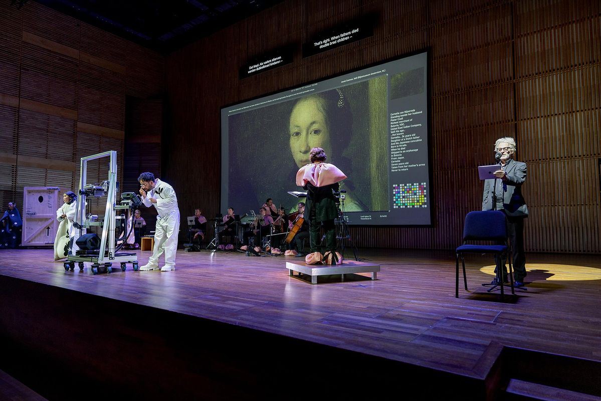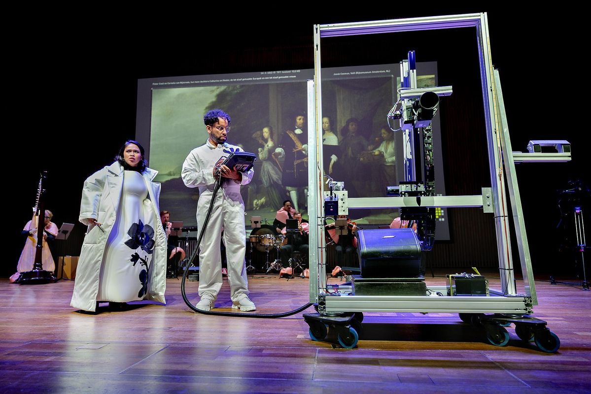 The performance imagines a magical moment in the restoration process: a singular night-time encounter of heterogeneous identities and cultures, breaking through the limits of time and space — between canvas and reality, past and present, East and West. Two women meet, each determined in her own way to rewrite colonial history. Present at their exchange is a “scanning robot” — an artificial intelligence designed to neutrally analyze data, but which turns out to have a voice of its own.